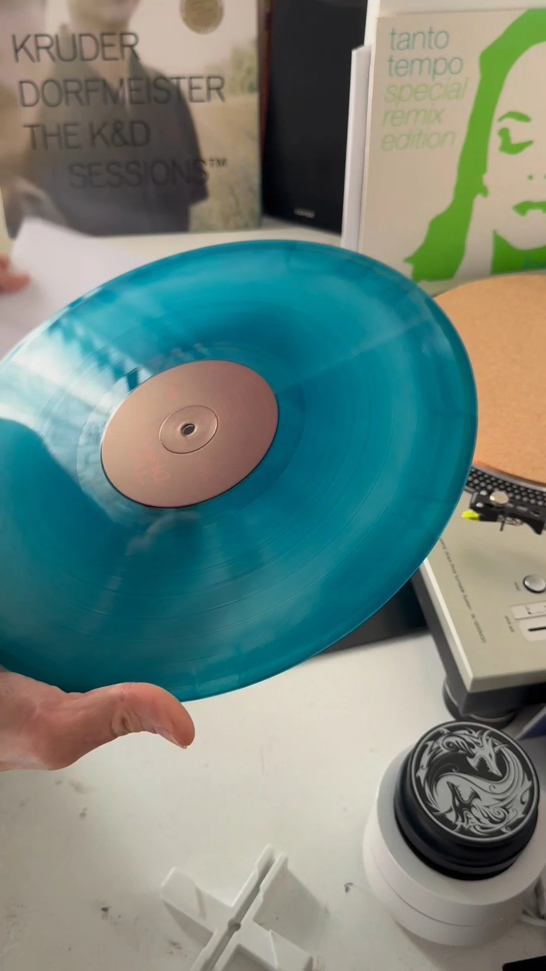 A photo of the original Record Props wall that started it all, showing a tightly spaced design above the Technics.
